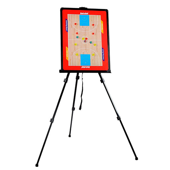 Pizarra de 63,5x44cm con terreno de juego de fútbol en una cara y baloncesto en otra cara. Bolsa para el transporte con varios bolsillos para llevar complementos. Incluye fichas (12+12+3) borrador, rotulador y trípode para colocar la pizarra del entrenador con sistema de regulación telescópico y patas ovaladas. Regulación de 50cm a 120cm Ideal para entrenamientos y organización de tácticas. Medidas: 69x48,5x10,5cm.