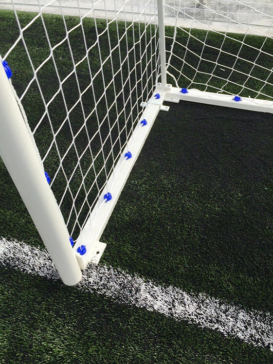 ANCLAR SIEMPRE AL SUELO. Todas las porterías trasladables SOFTEE EQUIPAMENT metálicas incluyen, marco de 80 mm y bases en acero de sección 80x40 mm, ganchos de poliamida para sujetar la red a la parte trasera del marco y a la base, arquillos metálicos traseros por donde desciende la red y por último también incluye cada portería 4 pletinas con agujeros de 1,5 mm por si tiene necesidad u ocasión de anclarlas al suelo.