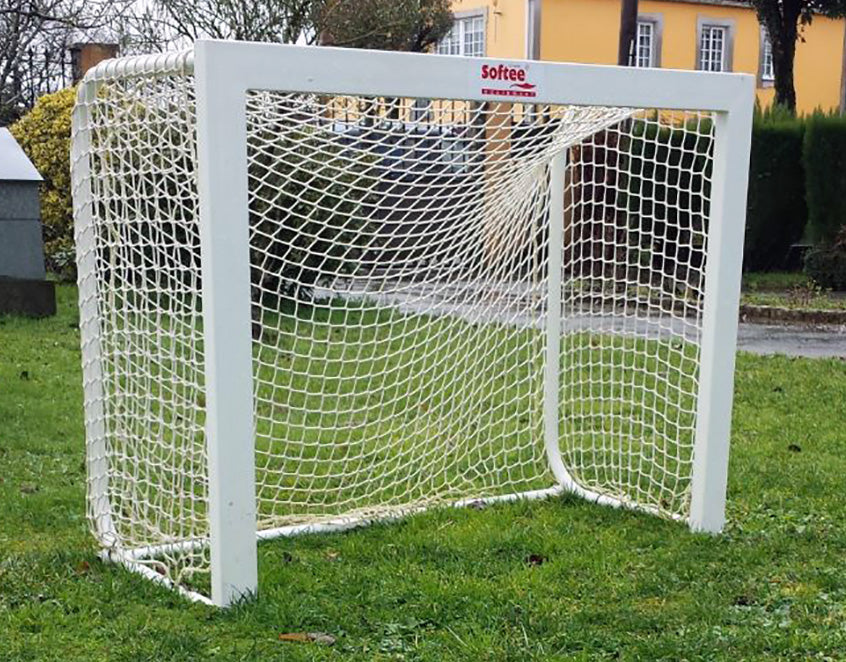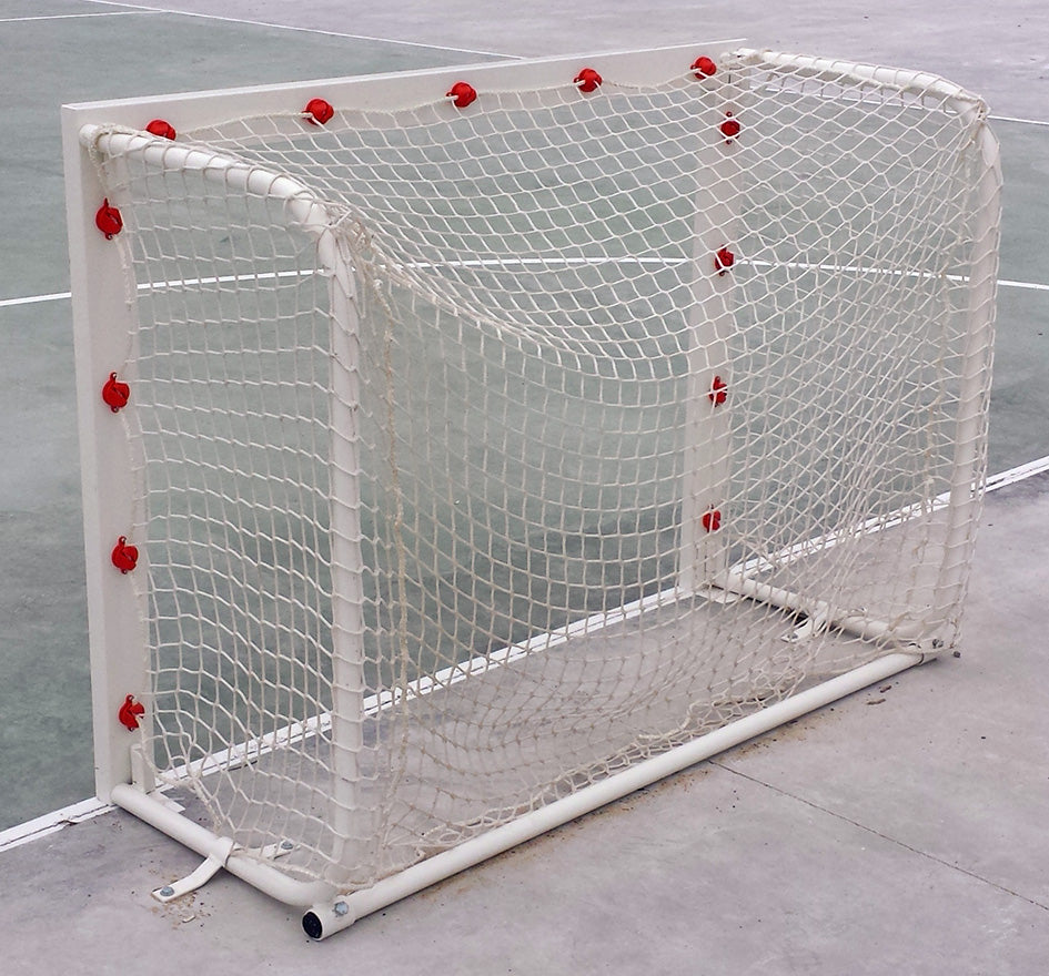 Portería con arquillos plegables de 33mm y marco metálico de 80x40mm. Provista de ganchos para sujeción de red (no incluida). Posible suministro de sistemas de seguridad simple o dobles para su amarre al suelo. Venta por unidad. Ideal para entrenamientos. Medidas: 140x105cm. Peso: 17kg.
